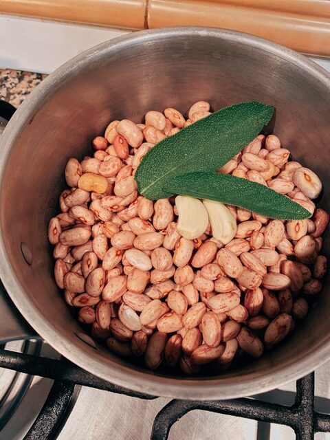 Saliek katlā pupas, garšaugus un ķiploku, aplej ar ūdeni un vāra uz vidējas uguns stundu vai – līdz pupas ir pilnīgi mīkstas. Sāli pieber, kad pupas jau ir gandrīz gatavas.
