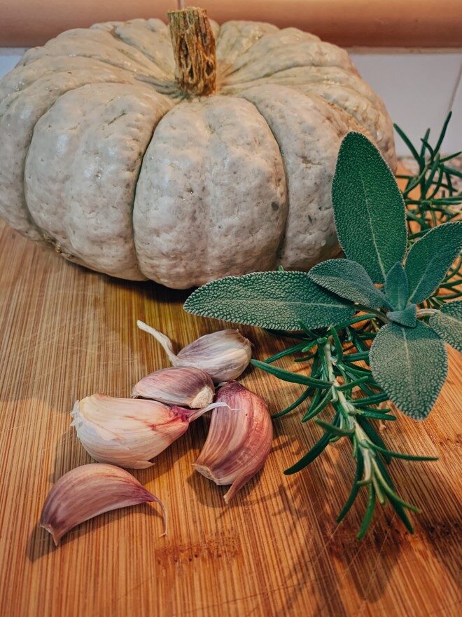 Uzsildīt cepeškrāsni 180 C. Izņem ķirbja sēklas, visu ķirbi ar mizu viegli apsmērē ar olīveļļu un liek pannā cepties kopā ar ķiploku, garšvielām un mazliet sāli. Cep, līdz ķirbis ir pilnīgi mīksts, vismaz 30 min. Ja ķirbim miza ir ļoti plāna, es iesaku to atstāt. Mazāk darba un garšīgi!