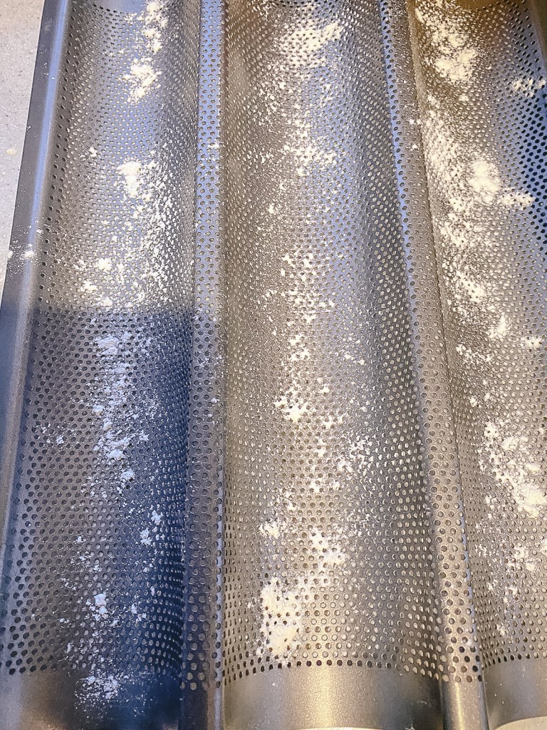 Tad ņem ārā no ledusskapja, uz miltiem apkaisītas virsmas mīklu saveļ rullī, ko sadala 3 daļās. Katru ierullē, lai izveidojas gara “desiņa”. Tās kārto speciālā veidnē, bet var bez tās arī iztikt un likt uz cepešpannas.