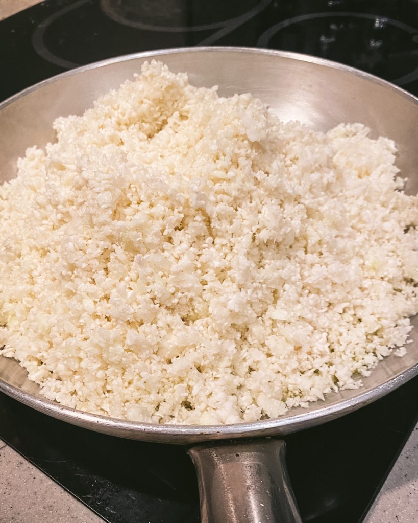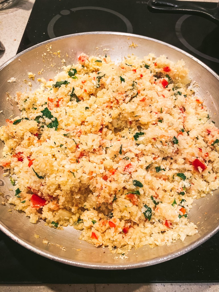 Sasmalcina puķkāpostu , 1-2 ķiploku daivas, čili piparu, liek cepties pannā ar olīvelļu. Pievieno garšvielas pēc sirds patikas. Uzliek vāku un sautē apmēram 10 min, beigās pievieno kindzu. Ja ir vēlme, var pārkaisīt ar rīvētu parmezānu.