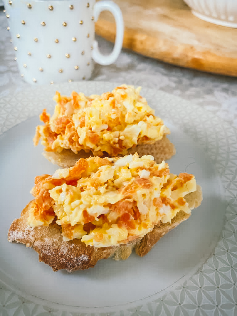 Cieti novāra olas. Novāra burkānus. Bļodiņā sarīvē sieru, novārītos burkānus, olas, ķiploku. Sajauc ar mājās gatavotu majonēzi, jogurtu un melnajiem pipariem. Sāli mēs papildus nepievienojam, jo siers ir pietiekami sāļš.