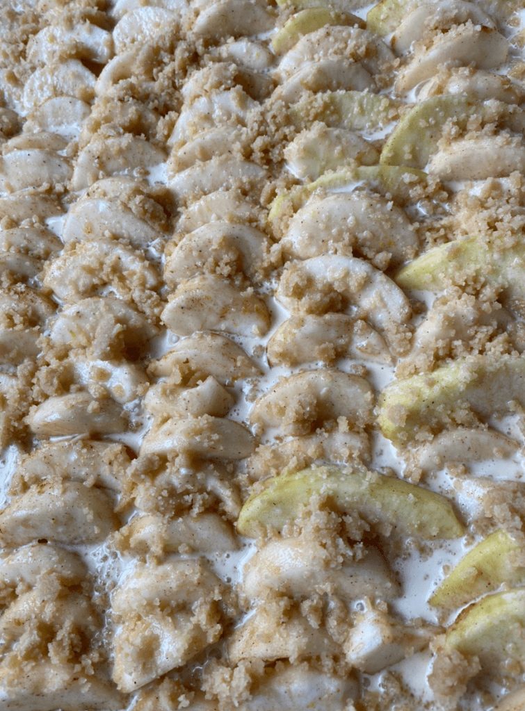 Šķidrumu no āboliem sajauc ar 1 -2 olām, pēc vēlēšanās var pielikt 2 ēdamkarotes saldā krējuma, to visu pārlej āboliem.