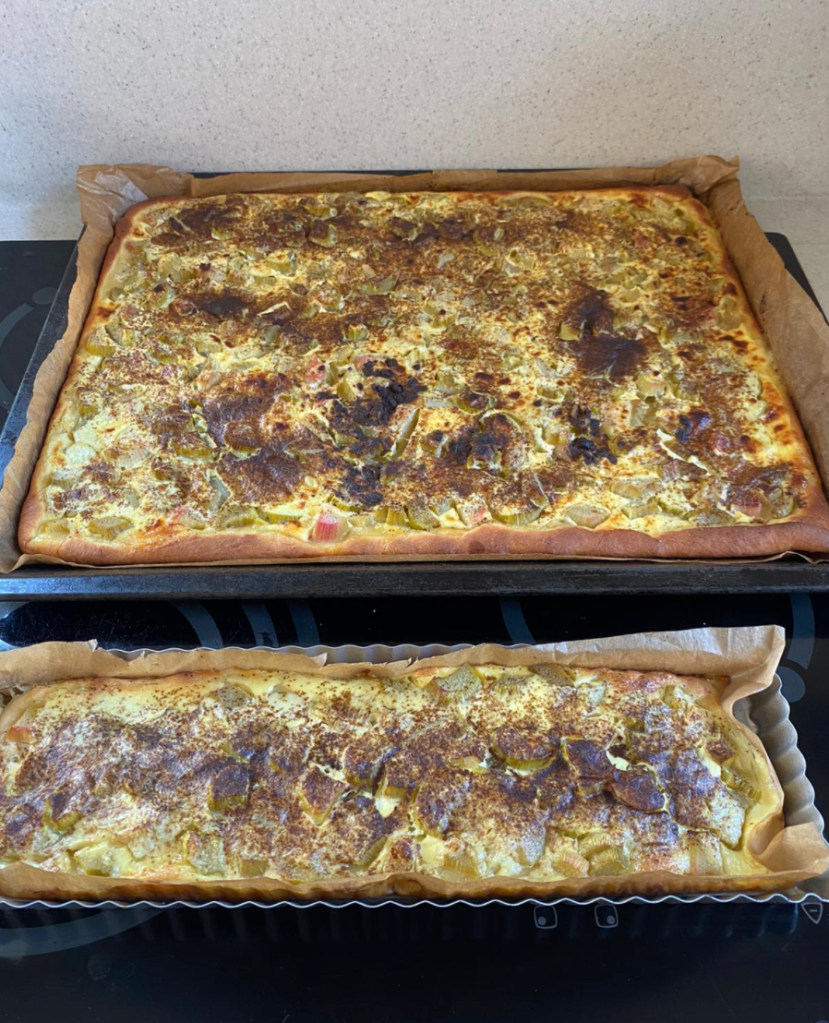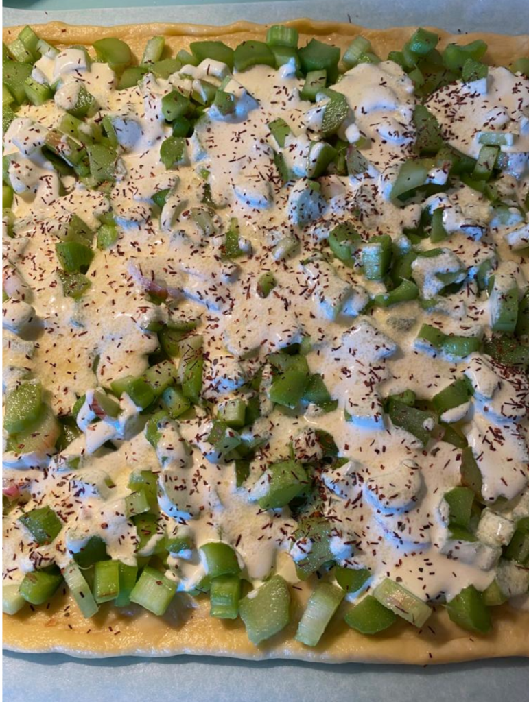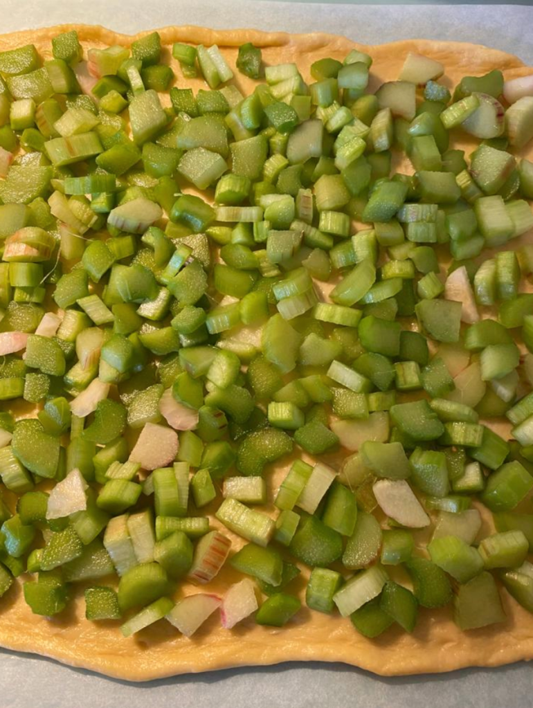 Izrullē uz cepampapīra mīklu cepešpannas izmērā, 2-3 mm biezu. Liek pannā, pārber ar rabarberiem, pārlej ar krējumu vai jogurtu, kam pievienots atlikušais cukurs (50 g). Uzkaisa kanēli.