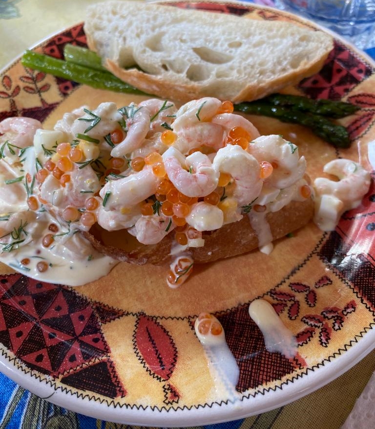 - Masā iemaisa ikrus , bagātīgi uzliek uz maizes un pa virsu liek lielu kaudzi ar garnelēm.