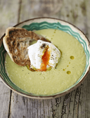 Sagrieztos sparģeļus no liek malā vēlākam zupas gatavošanas procesam. Sakapā sparģeļu kātiņus. Nepieciešama liela un dziļa panna, kurā pievieno olīveļļu. Apcep sīpolus, selerijas un puravus apmēram 10 min., līdz kļuvuši mīksti, pievieno buljonu un sasmalcinātos sparģeļu kātus un vāra 20 min., uz lēnas uguns. Noņem no plīts un sablenderē ar rokas blenderi, pievieno sāli, piparus un sparģeļu galus, uzvāra un turpina vārīt uz lēnas uguns vēl pāris minūtes līdz tie kļuvuši mīksti. Atsevišķi verdošā ūdenī ieliek pāršķeltas 10 olas un pavāram dažas minūtes, nav nepieciešams uztraukties par to izskatu, viņām nav jābūt perfektām. Apgrauzdē ciabatas sķēles. Izņem no verdošā ūdens pāršķeltās olas un uzliek uz tās pa sviesta piciņai, liek virsū uz maizes pirms pasniegšanas.