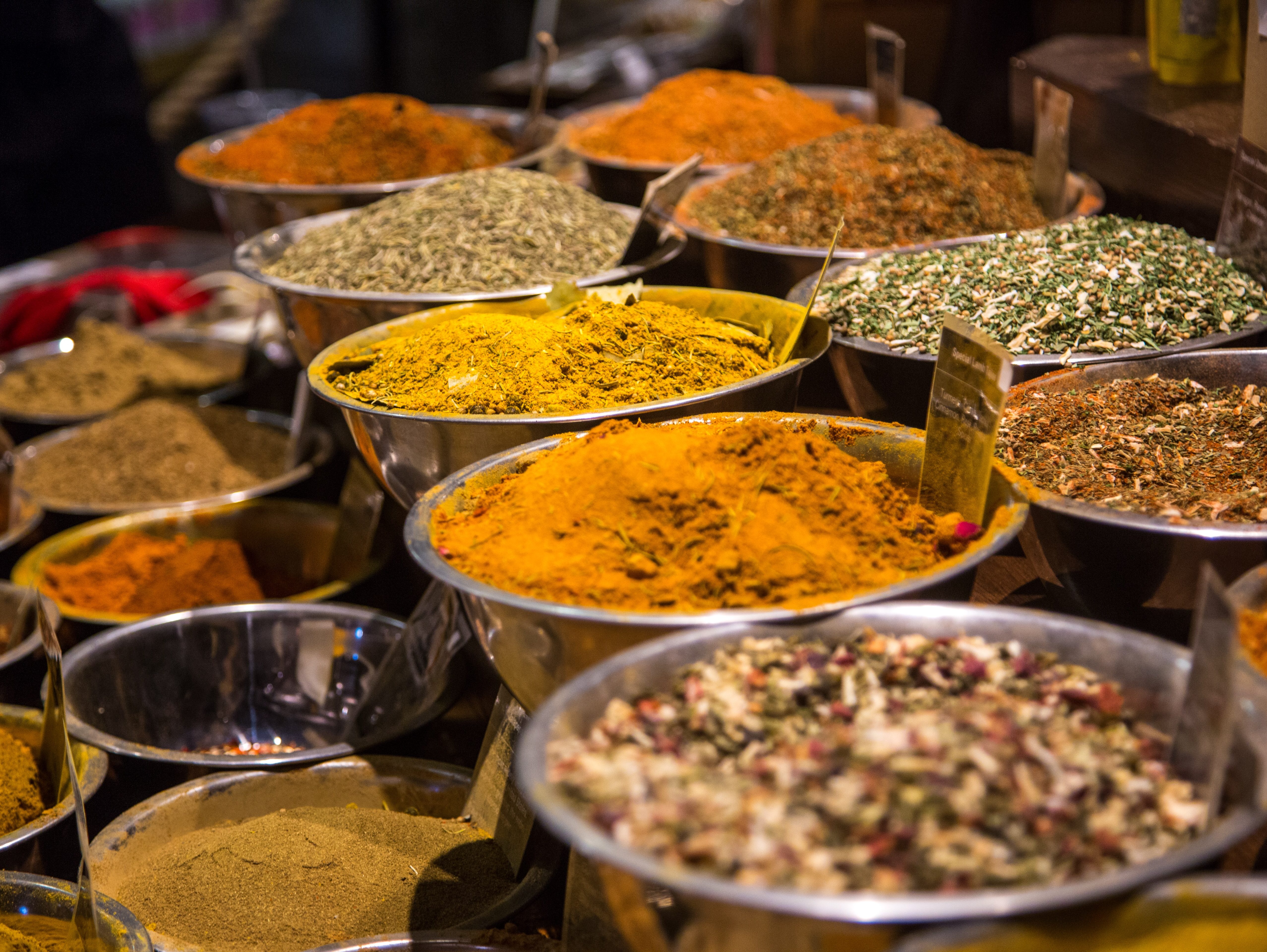 Ķiploks, sīplols, lauru lapas, pētersiļi, kinza, rozmarīns, baziliks, oregāno, dažāda veida pipari, čilli, krustnagliņas, turmeriks, ķimenes, koriandrs, ingvers,fenhelis, anīss.